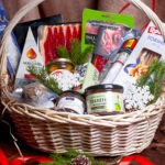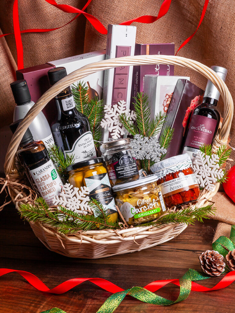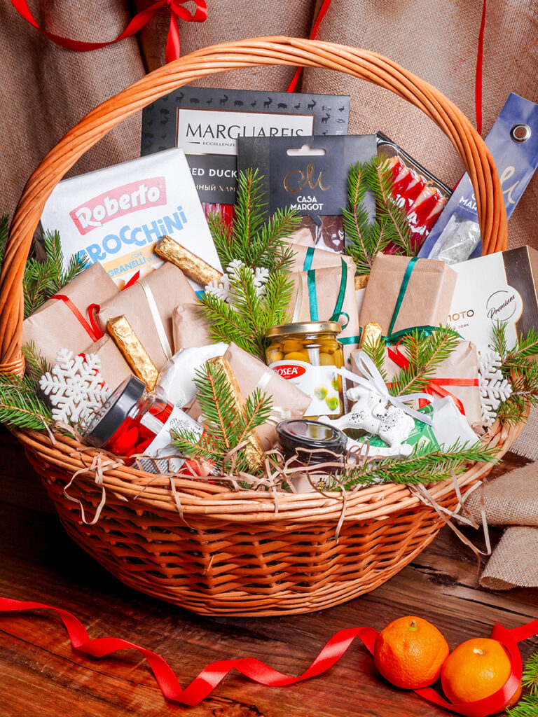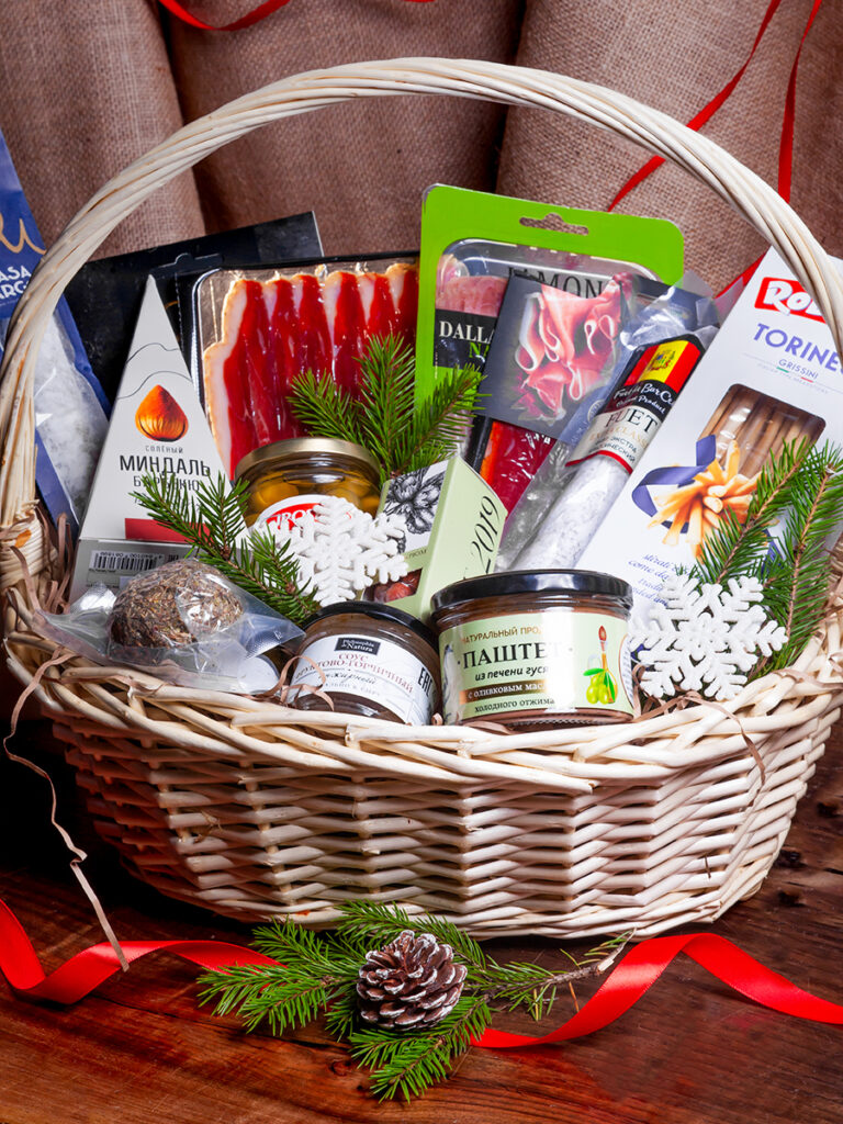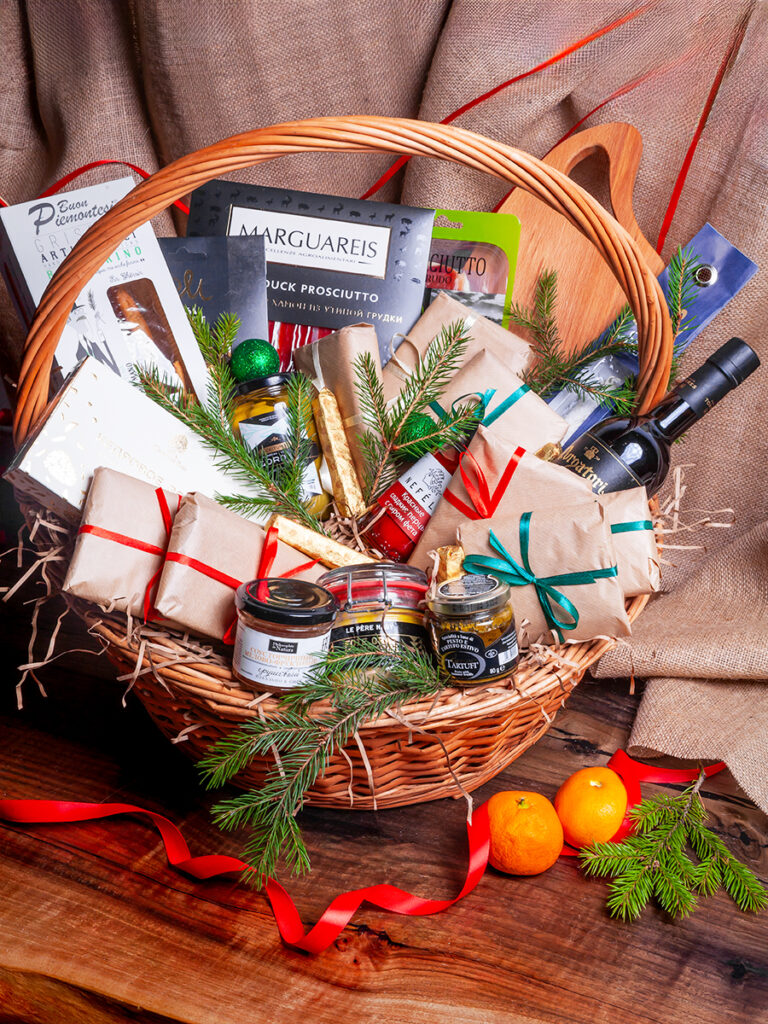 — Мясные деликатесы: хамон, прошутто, вяленые колбасы — Паштеты, риеты , фуа- гра — Оливки, вяленые томаты, трюфель, масла и уксусы — Шоколад, конфеты, нуга, конфитюры, мёд — Напитки к набору — Аксессуары, свечи, открытки — по желанию