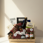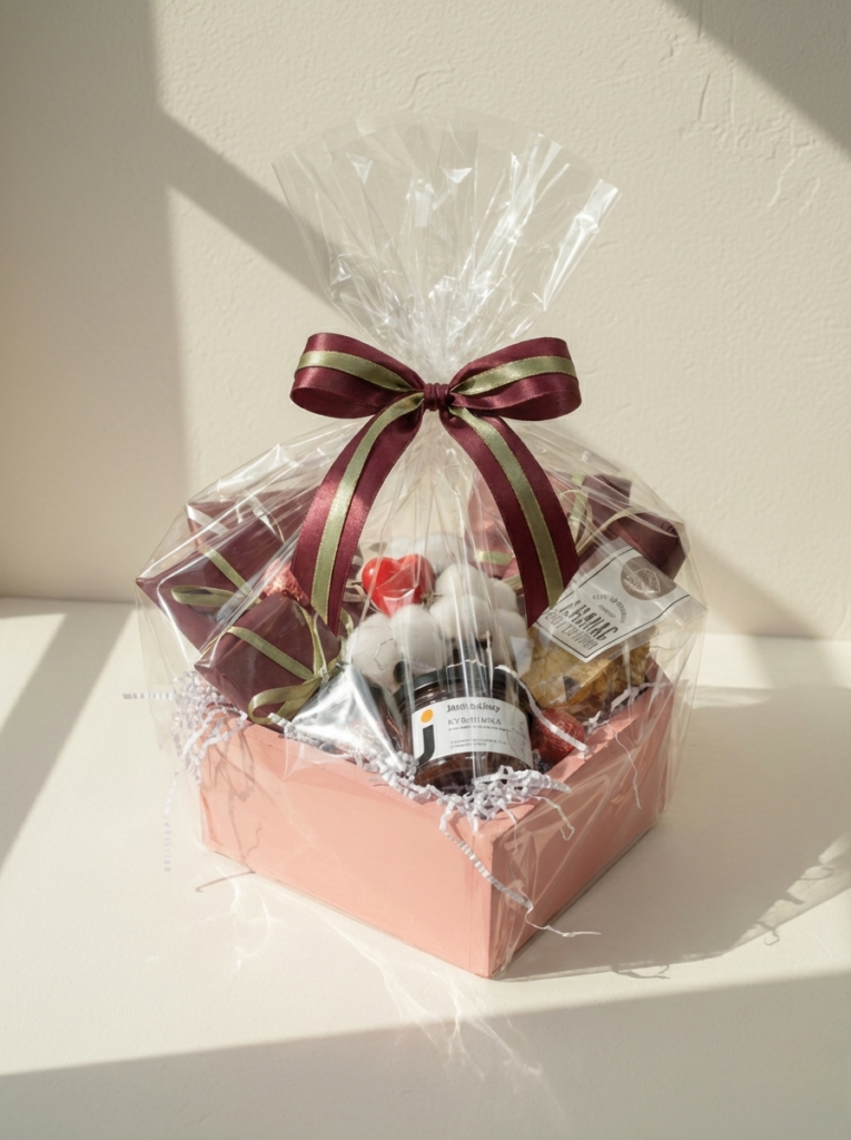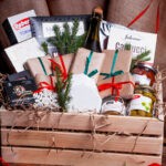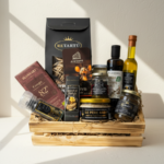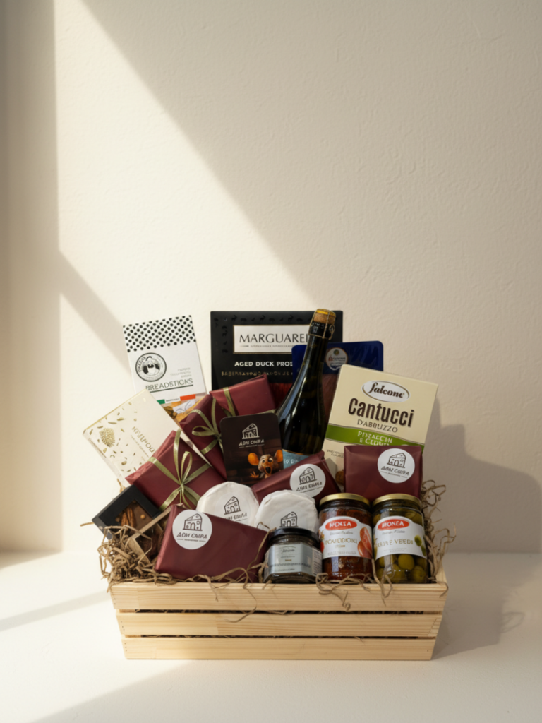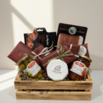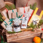 — Мясные деликатесы: хамон, прошутто, вяленые колбасы — Паштеты, риеты , фуа- гра — Оливки, вяленые томаты, трюфель, масла и уксусы — Шоколад, конфеты, нуга, конфитюры, мёд — Напитки к набору — Аксессуары, свечи, открытки — по желанию
