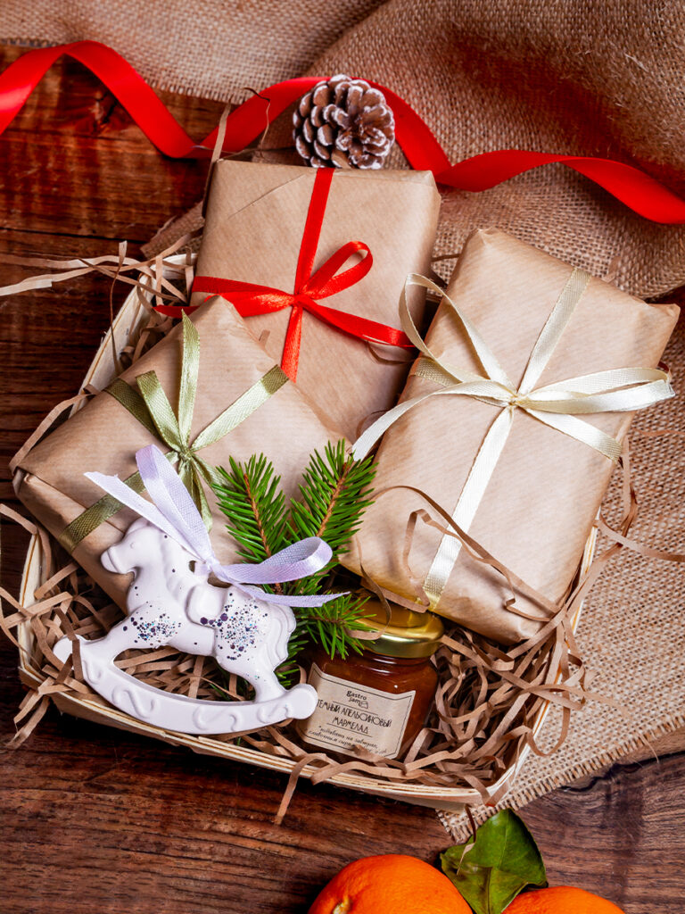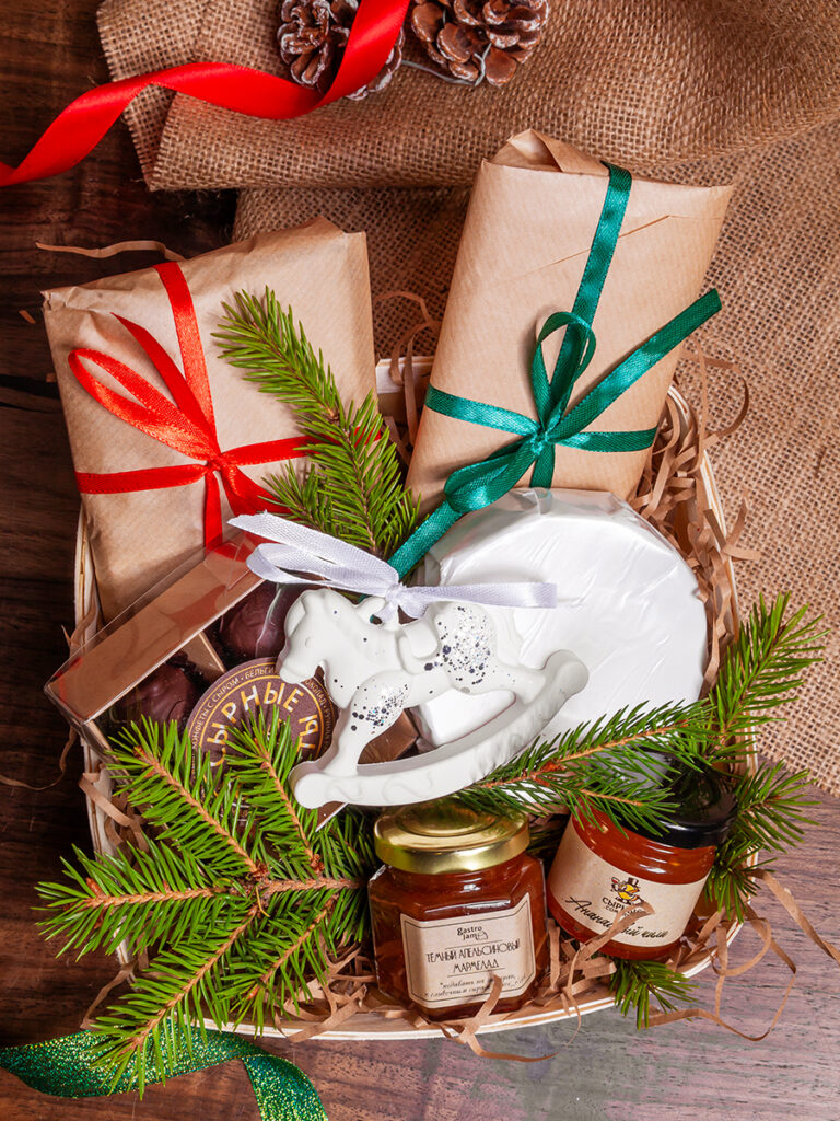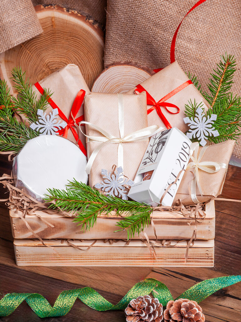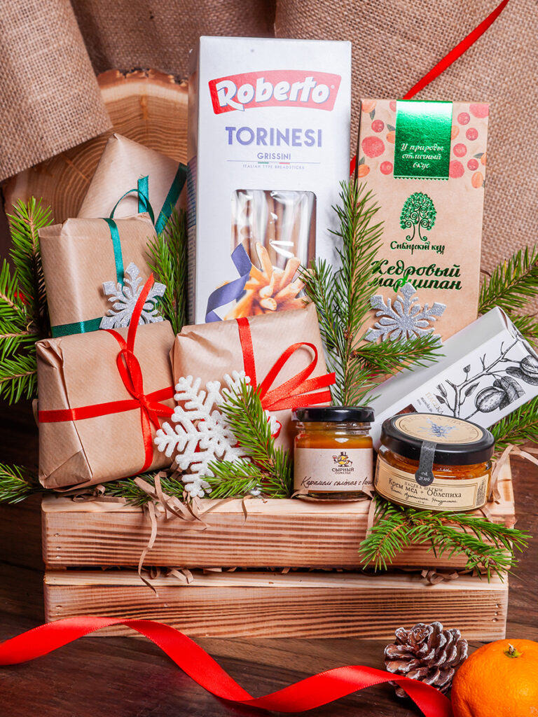 Мы используем ящики из натурального дерева. Возможно оформление брендированной лентой, открытками и, по желанию, гравировкой. Каждый ящик празднично оформлен: живая ель( нобилис ), декор, элементы уюта и зимнего настроения.